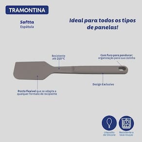 A espátula Tramontina Softta em silicone cinza é ideal para quem busca agilidade e conforto na cozinha. Feita em silicone resistente a até 210 C, pode ser usada em todos os tipos de panelas, inclusive as antiaderentes, sem causar danos. Seu corpo ível alcança todos os cantos do recipiente, facilitando na hora de mexer ou raspar massas com precisão. O cabo ergonômico garante mais firmeza no manuseio, e a limpeza é simples: vai direto à lava-louça. Com visual neutro e acabamento moderno, é um utensílio que une funcionalidade e praticidade em qualquer preparo.