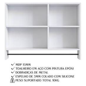 Espelheira e Gabinete com Cuba, desenvolvido para oferecer praticidade e organização ao ambiente. Estrutura em MDP com acabamento em pintura UV texturizada. Possui toalheiros (em aço com pintura epóxi), gavetão com corrediças telescópicas, nichos, porta basculante invertida com sistema de pistão a gás, abertura tipo cava, porta com espelho integrado, prateleiras internas e cuba retangular em mármore sintético. Fixação por meio de parafusos. Este produto será entregue em 3 volumes.