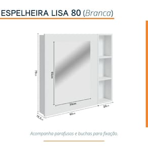 Espelho de 550 X 390 X 03 mm com acabamento lapidado, estruturado em porta de MDP BP (15mm). Possui prateleiras internas e porta com dobradiças slow, com sistema de amortecedor. Ao lado, acompanha Nicho de 20cm x 70cm, com prateleiras para maior organização. Acompanha tampa parafusos buchas de nylon parafusos para fixação na parede. Possui manual de instalação. Espelheira ideal para compor com os produtos da marca BUMI MÓVEIS, e os produtos da marca BLU LAVATÓRIOS (vide site do Madeira Madeira). Produto sai montado de fábrica, devidamente regulado, bastando apenas fixá-lo na parede. Garantia de 12 meses para defeito de fabricação. Acabamento da Porta: BP Acabamento da Prateleira: BP Altura do Espelho: 55 Ambiente Principal: Banheiro Composição: 70% MDP BP e 30% VIDRO Cor: Branco Cor do Produto: Branco Cor Interna: Branco Escala de Brilho: Acetinado Espessura do Espelho: 3 Formato do Espelho: Retangular Informações Complementares: Produto sai montado de fábrica, devidamente regulado, bastando apenas fixá-lo na parede. Itens Inclusos: 01 Espelheira Lisa 80cm Largura do Espelho: 39 Linha ou Coleção: Ripy Manual de Montagem e Instalação: https://product-hub-prd.madeiramadeira.com.br/906054/documents/c99cac5d-8f68-4823-bb40-565b928f4ade193257234861715173202101.pdf Material da Porta: MDF/MDP Material da Prateleira: MDF/MDP Material Principal: MDF/MDP Necessita Montagem: Não Origem do Produto: Nacional Peso: 13,85 kg Peso Máximo por Prateleira: 2 Possui Espelho: 01 Possui iluminação: Não Possui Portas: 01 Possui Prateleiras: 05 Possui Toalheiro: Não Possui Tomadas: Não Recomendações de Uso, Manutenção e Limpeza: Nunca utilizar produtos químicos. Use somente flanela levemente umedecida em água e em seguida uma outra seca e macia. Caso ocorra vazamento ou acúmulo de água no produto, enxugar imediatamente. Tipo de Dobradiça/Corrediça da Porta: Metálica Tipo de Fixação do Espelho: Parafusos Tipo de Porta: Bater Tipo de Puxador da Porta: Não Possui