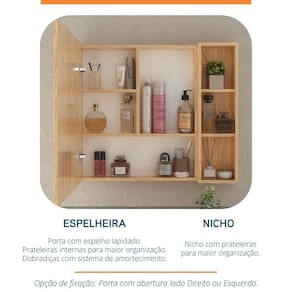 Espelho de 550 X 390 X 03 mm com acabamento lapidado, estruturado em porta de MDP BP (15mm). Possui prateleiras internas e porta com dobradiças slow, com sistema de amortecedor. Ao lado, acompanha Nicho de 20cm x 70cm, com prateleiras para maior organização. Acompanha tampa parafusos buchas de nylon parafusos para fixação na parede. Possui manual de instalação. Espelheira ideal para compor com os produtos da marca BUMI MÓVEIS, e os produtos da marca BLU LAVATÓRIOS (vide site do Madeira Madeira). Produto sai montado de fábrica, devidamente regulado, bastando apenas fixá-lo na parede. Garantia de 12 meses para defeito de fabricação. Acabamento da Porta: BP Acabamento da Prateleira: BP Altura do Espelho: 55 Ambiente Principal: Banheiro Composição: 70% MDP BP e 30% VIDRO Cor: Wood Cor do Produto: Wood Cor Interna: Bege Escala de Brilho: Acetinado Espessura do Espelho: 3 Formato do Espelho: Retangular Informações Complementares: Produto sai montado de fábrica, devidamente regulado, bastando apenas fixá-lo na parede. Itens Inclusos: 01 Espelheira Ripy 80cm Largura do Espelho: 39 Linha ou Coleção: Ripy Manual de Montagem e Instalação: https://product-hub-prd.madeiramadeira.com.br/906055/documents/8534bee7-771b-4e5e-aa63-57aaa217c46f1932663348617151733146065.pdf Material da Porta: MDF/MDP Material da Prateleira: MDF/MDP Material Principal: MDF/MDP Necessita Montagem: Não Origem do Produto: Nacional Peso: 13,85 kg Peso Máximo por Prateleira: 2 Possui Espelho: 01 Possui iluminação: Não Possui Portas: 01 Possui Prateleiras: 05 Possui Toalheiro: Não Possui Tomadas: Não Recomendações de Uso, Manutenção e Limpeza: Nunca utilizar produtos químicos. Use somente flanela levemente umedecida em água e em seguida uma outra seca e macia. Caso ocorra vazamento ou acúmulo de água no produto, enxugar imediatamente. Tipo de Dobradiça/Corrediça da Porta: Metálica Tipo de Fixação do Espelho: Parafusos Tipo de Porta: Bater Tipo de Puxador da Porta: Não Possui