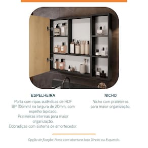 Espelho de 550 X 390 X 03 mm com acabamento lapidado, estruturado em porta com ripas autênticas de HDF BP (06mm). Possui prateleiras internas e porta com dobradiças slow, com sistema de amortecedor. Ao lado, acompanha Nicho de 20cm x 70cm, com prateleiras para maior organização. Acompanha tapa furos buchas de nylon parafusos para fixação na parede. Possui manual de instalação. Espelheira ideal para compor com os Armários e Gabinetes da marca BUMI MÓVEIS, e as Bancadas e Lavatórios da marca BLU LAVATÓRIOS (vide site do Madeira Madeira). Produto sai montado de fábrica, devidamente regulado, bastando apenas fixá-lo na parede. Garantia de 12 meses para defeito de fabricação. Acabamento da Porta: BP Acabamento da Prateleira: BP Altura do Espelho: 55 Ambiente Principal: Banheiro Composição: 80% de HDF BP e 20% de espelho Cor: Preto Cor do Produto: Preto Cor Interna: Preto Escala de Brilho: Acetinado Espessura do Espelho: 3 Formato do Espelho: Retangular Informações Complementares: Produto sai montado de fábrica, devidamente regulado, bastando apenas fixá-lo na parede. Itens Inclusos: 01 Espelheira Ripy 80cm Largura do Espelho: 39 Linha ou Coleção: Ripy Manual de Montagem e Instalação: https://product-hub-prd.madeiramadeira.com.br/896598/documents/0f82a425-3233-43c0-bf5b-5da246090239193170034861715109232193.pdf Material da Porta: MDF/MDP Material da Prateleira: MDF/MDP Material Principal: MDF/MDP Necessita Montagem: Não Origem do Produto: Nacional Peso: 14 kg Peso Máximo por Prateleira: 2 Possui Espelho: 01 Possui iluminação: Não Possui Portas: 01 Possui Prateleiras: 05 Possui Toalheiro: Não Possui Tomadas: Não Recomendações de Uso, Manutenção e Limpeza: Nunca utilizar produtos químicos. Use somente flanela levemente umedecida em água e em seguida uma outra seca e macia. Caso ocorra vazamento ou acúmulo de água no produto, enxugar imediatamente. Tipo de Dobradiça/Corrediça da Porta: Metálica Tipo de Fixação do Espelho: Parafusos Tipo de Porta: Bater Tipo de Puxador da Porta: Não Possui