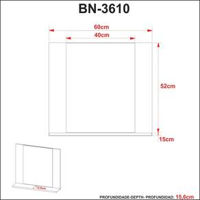 A Espelheira Suspensa para Banheiro BN3610 é produzido em MDP 15mm, pintura UV. Possui 1 prateleira que suporta até 3kgs. Possui espelho 3mm que vai colado no painel. Conteúdo da embalagem: móvel, ferragens e manual de montagem. A fixação das peças e/ou acessórios é feita por parafusos. Para uma limpeza mais efetiva, utilizar apenas pano macio umedecido e sabão neutro. Não utilizar produtos abrasivos. Garantia de 03 meses contra defeitos de fabricação. Medidas do produto (AxLxP): 54x60x15,6cm. Peso do produto: 6,35kgs.