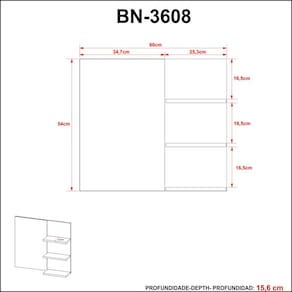 Quando falamos de banheiro pensamos em bem-estar. Pois o banheiro é onde a gente recarrega nossa energia, idealiza nossos sonhos e realiza toda a manutenção necessária para uma saúde física e mental melhor. Com design prático e funcional, o móvel entrega ao ambiente toques de modernidade e elegância. Multifuncional, acondiciona produtos de higiene e beleza como porta escova, papel higiênico, toalhas, artigos de limpeza entre tantos outros objetos de uso pessoal. Espelheira Suspensa para Banheiro BN3608. Possui espelho e três prateleiras. Estrutura em MDP e acabamento em pintura UV. Montagem flex reversível. Imagem meramente ilustrativa. A decoração do ambiente não acompanha o produto, produto é entregue desmontado, novo, acompanha procedência garantida, manual de montagem e ferragem. Produto: Espelheira Suspensa para Banheiro 60cm com 3 Prateleiras BN3608 Cor: Mármore Branco Acabamento: Pintura UV Material: MDP Altura (cm): 54 Largura (cm): 60 Profundidade (cm): 15,6 Peso (kg): 6,2 Peso Suportado: 3kg cada prateleira. Prateleiras: 3 Gavetas: 0 Portas: 0 Puxador: 0 - Material: 0 Rodízio: 0 Garantia: A Tecnomobili tem o compromisso permanente com a qualidade de seus produtos. Nosso período de garantia é 03 (três) meses contra defeitos de fabricação. Limpeza e Conservação: Para uma limpeza mais efetiva, utilizar apenas pano macio umedecido e sabão neutro. Não utilizar produtos abrasivos. Necessita Montagem: Sim. Aconselhamos que a montagem seja feita por um . O produto será entregue desmontado. Não disponibilizamos montagem. Após montado não expor o móvel a fonte de calor ou umidade. Imagem meramente ilustrativa. A decoração do ambiente não acompanha o produto. produto lacrado acompanhado de procedência garantida. Referência: BN3608.0003 Marca: Não Informado