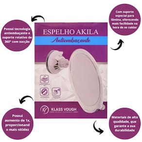 O Espelho Akila Atiembaraçante possui tecnologia antiembaçante e suporte rotativo de 360 com sucção, ele é o companheiro ideal para usar durante o banho, garantindo praticidade e eficiência. Além disso, o Akila possui aumento de 1x, proporcionando mais nitidez, e um suporte especial para lâmina, oferecendo mais facilidade na hora de se cuidar. O Espelho Akila é feito com materiais de alta qualidade, que garante a sua durabilidade, além do tamanho que se encaixa perfeitamente em qualquer banheiro.