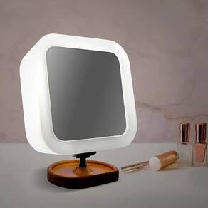 A base em madeira tratada serve como apoio para bijuterias, maquiagens ou pequenos objetos, tornando o produto ainda mais versátil e organizado. Ideal para quartos, camarins ou bancadas, une iluminação eficiente e estética sofisticada.
