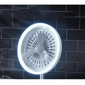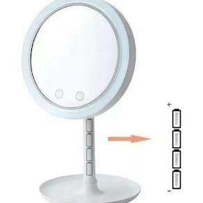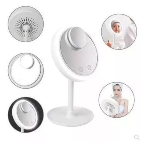 - Material: Polipropileno e Componentes Eletrônicos. - Alimentação: por cabo USB ou com 4 Pilhas AA 1.5v (Não incluso). - Voltagem: 5v. - Quantidade de LED: 40 LED. - A Função Ventilador possui 3 Velocidades. - Possui 2 tipos de espelho, o maior que tem a visão normal e o menor que tem um aumento de 5x para te ajudar naquele detalhe. - Espelho com Botão Touch Screen na parte frontal para Ligar e Desligar as funções. - Possui base removível - O espelho possui um espaço na base para você deixar os seus produtos de maquiagem acolhidos enquanto os usam.