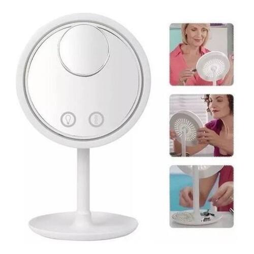 - Material: Polipropileno e Componentes Eletrônicos. - Alimentação: por cabo USB ou com 4 Pilhas AA 1.5v Não incluso . - Voltagem: 5v. - Quantidade de LED: 40 LED. - A Função Ventilador possui 3 Velocidades. - Possui 2 tipos de espelho, o maior que tem a visão normal e o menor que tem um aumento de 5x para te ajudar naquele detalhe. - Espelho com Botão Touch Screen na parte frontal para Ligar e Desligar as funções. - Possui base removível - O espelho possui um espaço na base para você deixar os seus produtos de maquiagem acolhidos enquanto os usam.