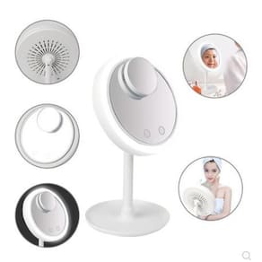 - Material: Polipropileno e Componentes Eletrônicos. - Alimentação: por cabo USB ou com 4 Pilhas AA 1.5v Não incluso . - Voltagem: 5v. - Quantidade de LED: 40 LED. - A Função Ventilador possui 3 Velocidades. - Possui 2 tipos de espelho, o maior que tem a visão normal e o menor que tem um aumento de 5x para te ajudar naquele detalhe. - Espelho com Botão Touch Screen na parte frontal para Ligar e Desligar as funções. - Possui base removível - O espelho possui um espaço na base para você deixar os seus produtos de maquiagem acolhidos enquanto os usam.