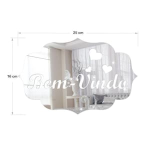 BV01 - Espelho Decorativo Bem Vindo em acrílico Sala QuartoCARACTERÍSTICAS:- Modelo:BV01- Espessura: 2 mmTAMANHO:01 x Espelho Bem Vindo de 25 x 16 cmACOMPANHA:01 x Espelho Decorativo Bem VindoAPLICAÇÃO:- Material mais resistente que o vidro além de ser mais leve também por isso os espelhos em Acrílico são indicados para o uso onde se preza pela segurança.ONDE APLICAR:- Casa: Parede de quarto, sala, varanda, etc...- Móveis em geral- Lojas: Vitrine- Escritório- Escola- CrecheCUIDADOS:- Nossos espelhos decorativos podem ser aplicados em qualquer superfície LISA, ideais para aplicação em paredes PLANAS, vidros, azulejos e onde mais sua imaginação mandar.- Utilize fitas dupla face para fixação dos espelhos. Kit já vai com as fitas.- Para limpeza utilizar flanela macia, mistura de água e um sabão suave.- O acrílico espelho possuí uma PELÍCULA de proteção no lado espelhado.- Essa PELÍCULA à primeira vista pode causar a impressão de riscado ou embaçado ás peças, mas é só remove-la após aplicar. Marca: Tecnotronics