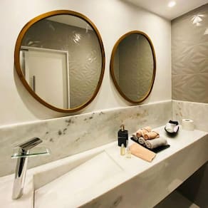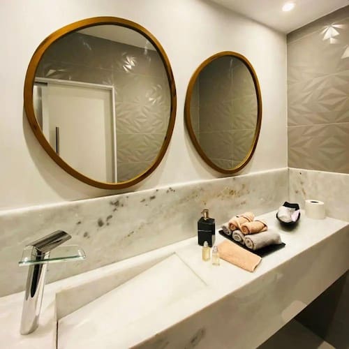 Nosso espelho orgânico compõe uma decoração moderna e arrojada em banheiros, lavabos, quartos, salas de estar, salas de jantar, corredores e halls de entrada.