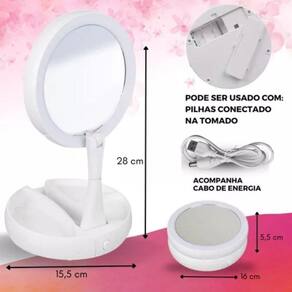 - possui luz de led ao redor, para maior visibilidade. - utiliza 4 pilhas aa, não inclusas. - dupla face giratória: contém um espelho de aumento e outro normal. - tamanho: - altura: 29 cm, - diâmetro do espelho: 16 cm - cor: branco. - marca: hoyle cabo de energia - possui organizador de acessórios - corpo articulado e dobrável Marca: My Foldaway Ean: 7891788720623