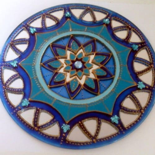Espelho de 20cm de diâmetro, pintura em vitral, decorado com pedrinhas em acrílico na cor azul.