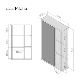 Medidas do Armário: Largura Total 42cm x Altura Total 70cm x Profundidade Total 13cm, nichos externos A 20cm x L 16cm x P 13cm, nichos internos A 20cm x L 26cm x P 13cm.