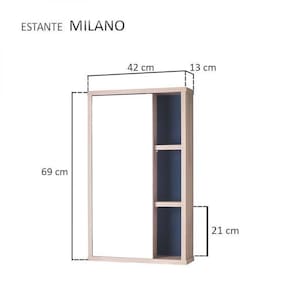 Medidas do Armário: Largura Total 42cm x Altura Total 70cm x Profundidade Total 13cm, nichos externos A 20cm x L 16cm x P 13cm, nichos internos A 20cm x L 26cm x P 13cm.