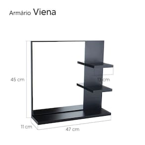 Espelho para Banheiro com Armário Preto Viena 45cm é a escolha perfeita para quem busca elegância, sofisticação e praticidade para seu banheiro. A espelheira possui 3 prateleiras externa para guardar e organizar itens de higiene pessoal e acessórios do seu banheiro, seu espelho é amplo, tornando-o um produto versátil.