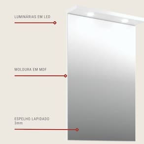 Nosso móvel foi desenvolvido para durar, por isso, a Espelheira é produzida em 100% MDF. Além disso, possui 2 luminárias LED bivolt, não necessitando de adaptação para ligar na tomada. Tudo isso pensado para deixar a iluminação do ambiente especial e aconchegante.