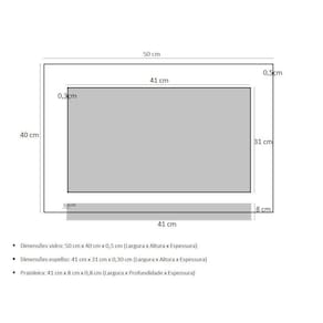 Espelho para banheiro com prateleira 50cm grafite Os nossos espelhos são ideais para banheiros e lavabos trazendo um toque especial no projeto de decoração e proporcionando um design moderno e arrojado no ambiente. Além da elegância, sofisticação e praticidade tem a qualidade e a durabilidade indiscutível, pois todos os itens podem molhar que não irá danificar, os vidros são pintados com tinta de alta performance, o que lhe garante a permanência da cor . Os suportes da prateleira e as tampas dos parafusos são de inox, mais uma de excelência da qualidade desse produto. Itens inclusos: - vidro temperado colorido: 50 cm x 40 cm largura x altura - espelho: 41 cm x 31 cm x largura x altura - prateleira: 41 cm x 8 cm largura x profundidade - kit parafusos completo para instalação Espessuras: - vidro temperado: 5 mm - espelho: 3 mm - prateleira: 8 mm Montagem: montagem e instalação não inclusa na venda ou preço do produto, elas são de inteira responsabilidade do cliente. Atenção: o espelho já vai fixado no vidro. Imagens ilustrativas.