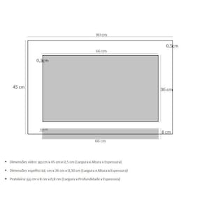 Espelho para banheiro com prateleira 80cm prata Os nossos espelhos são ideais para banheiros e lavabos trazendo um toque especial no projeto de decoração e proporcionando um design moderno e arrojado no ambiente. Além da elegância, sofisticação e praticidade tem a qualidade e a durabilidade indiscutível, pois todos os itens podem molhar que não irá danificar, os vidros são pintados com tinta de alta performance, o que lhe garante a permanência da cor . Os suportes da prateleira e as tampas dos parafusos são de inox, mais uma de excelência da qualidade desse produto. Itens inclusos: - vidro temperado colorido: 80 cm x 45 cm largura x altura - espelho: 66 cm x 36 cm x largura x altura - prateleira: 66 cm x 8 cm largura x profundidade - kit parafusos completo para instalação Espessuras: - vidro temperado: 5 mm - espelho: 3 mm - prateleira: 8 mm Montagem: montagem e instalação não inclusa na venda ou preço do produto, elas são de inteira responsabilidade do cliente. Atenção: o espelho já vai fixado no vidro. Imagens ilustrativas.