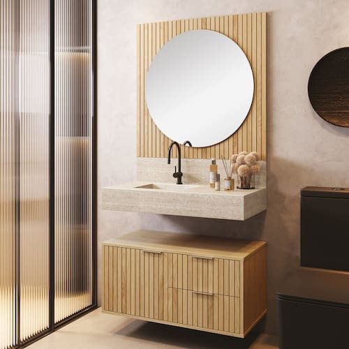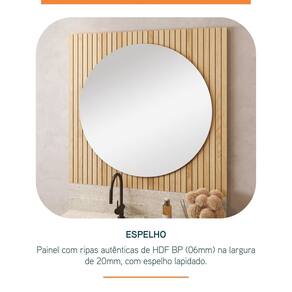 Espelho redondo de 700 X 700 X 03 mm com acabamento lapidado, estruturado em painel com ripas autênticas de HDF BP (06mm), na largura de 20mm. Acompanha tapa furos buchas de nylon parafusos para fixação na parede. Possui manual de instalação. Espelho ideal para compor com os Armários e Gabinetes da marca BUMI MÓVEIS, e as Bancadas e Lavatórios da marca BLU LAVATÓRIOS (vide site do Madeira Madeira). Produto sai montado de fábrica, devidamente regulado, bastando apenas fixá-lo na parede. Garantia de 12 meses para defeito de fabricação. Espessura: 15 Acompanha Manual de Instalação: Sim Altura do Espelho: 70 Ambiente: Banheiro Ambiente Principal: Banheiro Bisotê: Não Borda Decorada: Não Coleção: Ripy Composição: 70% de HDF BP e 30% de espelho Cor: Wood Cor do Produto: Wood Cor Interna: Bege Escala de Brilho: Acetinado Espessura do Espelho: 3 Formato: Quadrado Formato do Espelho: Redondo Iluminação de Fundo: Não Informações Complementares: Produto sai montado de fábrica, devidamente regulado, bastando apenas fixá-lo na parede. Itens Inclusos: 01 Espelho Ripy 80cm Largura do Espelho: 70 Linha ou Coleção: Ripy Manual de Especificação Técnica: https://product-hub-prd.madeiramadeira.com.br/896618/documents/5d591911-454b-4eca-b960-5cf9d69b7b2c1973106348617163159112809.pdf Manual de Montagem e Instalação: https://product-hub-prd.madeiramadeira.com.br/896618/documents/ce3f97a2-7e5d-4549-9f87-4661d83695af1931743348617151110546252.pdf Material Principal: MDF/MDP Modo de Aplicação: Vertical Necessita Montagem: Não Origem do Produto: Nacional País de Origem: Brasil Peso: 9 Peso Máximo por Prateleira: kg Possui Espelho: 01 Possui iluminação: Não Possui LED: Não Possui Moldura: Não Possui Portas: Não Possui Prateleiras: Não Possui Toalheiro: Não Possui Tomadas: Não Recomendações de Uso, Manutenção e Limpeza: Nunca utilizar produtos químicos. Use somente flanela levemente umedecida em água e em seguida uma outra seca e macia. Caso ocorra vazamento ou acúmulo de água no produto, enxugar imediatamente. Tipo de Espelho: De Parede Tipo de Fixação: Parafusos Tipo de Fixação do Espelho: Parafusos