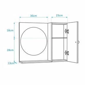 Suas medidas totais são: 58cm de Largura x 46cm de Altura x 13cm de Profundidade. O espelho mede: 33cm diâmetro. Peso: 7,5kg.