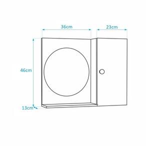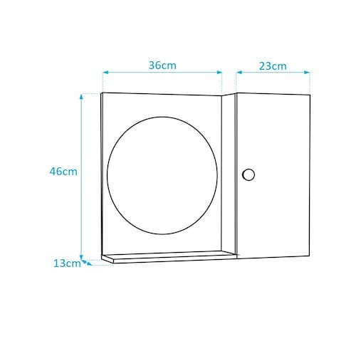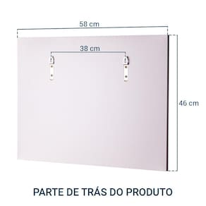 Suas medidas totais são: 58cm de Largura x 46cm de Altura x 13cm de Profundidade. O espelho mede: 33cm diâmetro. Peso: 7,5kg.