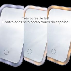 Composto por um espelho que acende com um botão touch no próprio espelho, possui uma camada de luz led em suas bordas, as luzes possuem 3 cores, frio, neutro e quente, perfeitas para se adaptarem a qualquer ambiente. Suas luzes podem ser ligadas, trocadas de intensidade, ou desligadas através do joão discreto em sua tela.