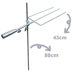 Você recebe: 1- Espeto triplo em aço com cabo de alumínio. 1- Haste de sustentação para posicionamento do espeto. Medidas: - Comprimento total: 75 cm - Comprimento cabo: 12 cm - Comprimento do espeto: 43 cm - Área útil: 40 cm - Espaço entre as hastes: 15 a 16 cm aproximadamente