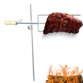 Espeto triplo com apoio para fazer um delicioso churrasco no fogo de chão; Com regulagem de altura e posição do espeto com relação ao fogo; Reforçado para o preparo de peças inteiras, ideal para todos os tipos de churrasqueiras; Ideal para o preparo de carnes, legumes, frutas e outras opções de alimentos que vão ao fogo.