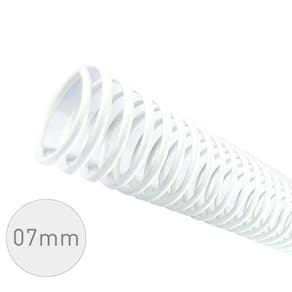 Espiral para Encadernação Branco 7mm 25 Folhas 100 und - Espiral plástico Colorido fabricado em PVC Semi-Rígido. - Diâmetro de 7mm para encadernar 25 folhas (24 kg / 75gr), com comprimento de 33cm. - Fio de 1,4mm. - Utilizado para encadernação de diversos fins, tais como apostilas, listas de preços, relatórios, cadernos, agendas, livros didáticos e etc. - Pacote acompanha 100 unidades de espirais branco. Produto plataforma Plast.