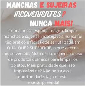 Riscos em paredes, manchas em inox, sujeiras em cerâmicas? NUNCA MAIS! Com a esponja mágica esses problemas acabaram! Afinal, além de tirar manchas e sujeiras indesejáveis, ela dispensa o uso de produtos químicos na limpeza.