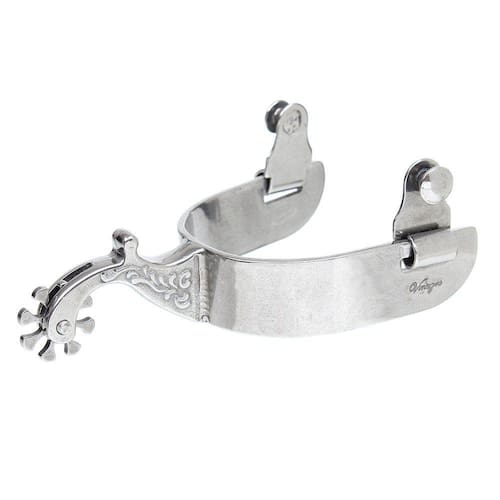 Espora Vinagre fabricada em Aço Inox. Possui cão com detalhes gravados na lateral, roseta de 8 pontas e garfo largo.