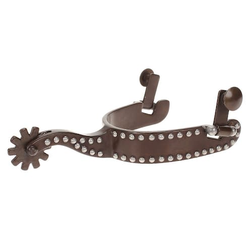 Par de esporas Metalab importadas modelo Antique Dots Spur Mens Level 4, fabricadas em aço de alta resistência, garfo com 1'' (2,54cm) de largura e apliques em rebites de metal, cão com 2-2/4'' (6,35cm) de comprimento e rosetas de 10 pontas. Fino acabamento.