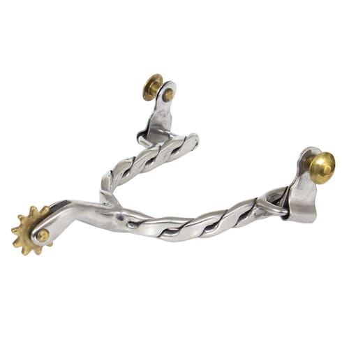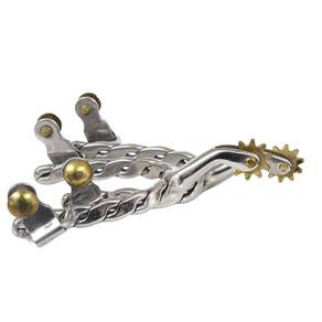 Uma Espora na qualidade M Reis modelo Roping Infantil, fabricada em Aço Inox, o Garfo da peça é estreito com detalhes torcidos e roseta de 11 pinos. Própria para as competições de Team Roping devido a sua única modelagem.