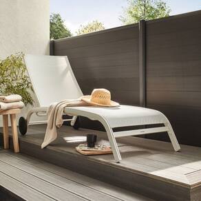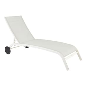 Espreguicadeira em aluminio reclinavel com 4 posicoes, material da estrutura em metal, assento e encosto em textilene retratil, cor branca da marca Naterial da colecao Lyra, estilo contemporaneo com 2 rodas, suporta ate 160 Kg, dimensoes de 95x63x207 cm, peso de 6,70 Kg, montagem desmontada, garantia do fabricante de 24 meses para defeitos de fabricacao.