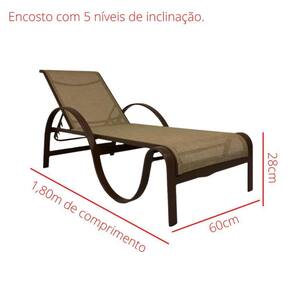 60cm de largura x 180cm de profundidade x 28cm de altura do chão ao assento (encosto com 5 níveis de inclinação)