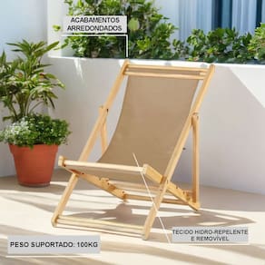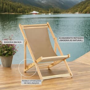 Espreguiçadeira de madeira maciça natural dobrável e reclinável em 4 posições, ideal para lazer interno e externo. Tecido hidro-repelente, reforçado e removível para fácil limpeza. Suporta até 100 kg, com estrutura em madeira maciça e acabamento natural.