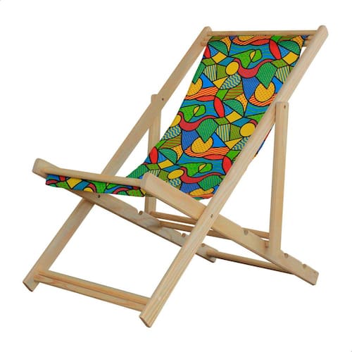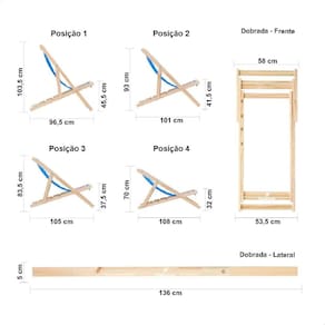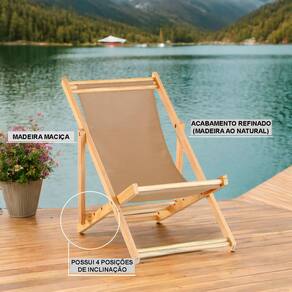 Espreguiçadeira de madeira maciça natural dobrável e reclinável em 4 posições, ideal para lazer interno e externo. Tecido hidro-repelente, reforçado e removível para fácil limpeza. Suporta até 100 kg, com estrutura em madeira maciça e acabamento natural.
