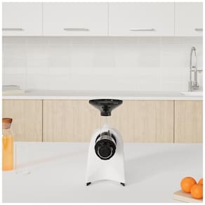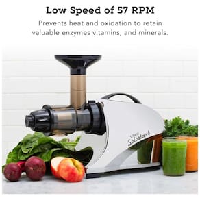 Espremedor de frutas de mastigação lenta horizontal Tribest Solostar SS4250B com sistema de prensa a frio, potência de 150W, operação em baixa velocidade para preservar nutrientes, produz sucos, massas, sorvetes, manteigas e molhos.Motor c/ dupla rotação