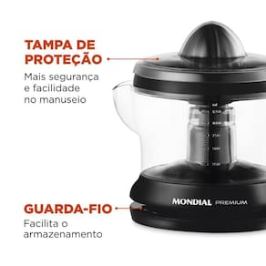 Com o Espremedor Turbo Citrus Premium Mondial E-02 você faz sucos deliciosos de forma rápida e preserva o frescor da fruta. A capacidade de 1,25 litros produz bastante suco e basta pressionar a fruta no espremedor para acionar o equipamento. Acompanha cone extra para você escolher seu suco favorito, com o máximo rendimento. Conta ainda com dupla rotação e tampa de proteção. Saiba mais sobre o E-02 da Mondial: