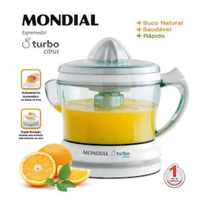 Faça sucos mais saudáveis de forma rápida e prática com o Espremedor de Frutas Turbo Citrus da Mondial. Com design moderno, esse espremedor de laranja mondial conta com jarra transparente com capacidade para até 1,25 litros que facilita a visualização da quantidade de líquido durante o preparo. O espremedor de suco possui acionamento automático que facilita a extração do líquido e auxilia no preparo de sucos muito mais naturais. Seu duplo sentido de rotação permite a extração de toda polpa da fruta e seu cone 2 em 1 possui um formato adaptado para extrair suco de laranja e limões com eficiência. Para facilitar o manuseio, o espremedor de frutas eletrico conta com guarda-fio que permite ajustar o comprimento do cabo elétrico. Produzido em plástico PP, um material que proporciona mais resistência e durabilidade para o espremedor de laranja eletrico. O espremedor de suco mondial conta ainda com tampa de proteção e jarra removível, para que você possa guardar o suco na geladeira sem precisar trocar de recipiente.