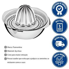 Ele é feito em aço inoxidável, o que garante durabilidade e resistência, possui um cone maior para extração mais fácil, e conta com um coador que impede que a polpa e as sementes misturem-se ao suco, além de uma trava de para uso estável.