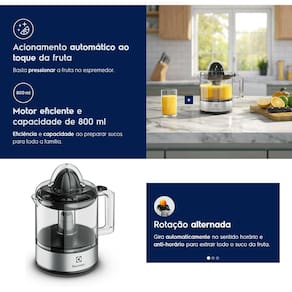 Espremedor de Laranja Limão Suco Inox ECP10 ELECTROLUX Frutas Efficient 800ml BPA Free Rotação Alternada1. Como funciona o Espremedor de Frutas Electrolux Efficient ECP10?O espremedor funciona pressionando a fruta contra o cone de espremer. O motor potente gira automaticamente o cone no sentido horário e anti-horário para extrair o suco da fruta.2. Quais tipos de frutas posso espremer com este aparelho?O Espremedor de Frutas Electrolux Efficient ECP10 é adequado para a maioria das frutas cítricas, como laranjas, limões, grapefruit e tangerinas.3. É fácil de limpar?Sim, os acessórios removíveis podem ser facilmente lavados à mão ou na máquina de lavar louça para facilitar a limpeza.4. Posso ajustar a textura do suco?Sim, o espremedor possui um filtro ajustável que permite escolher se deseja suco com ou sem gominhos.5. Este produto é seguro para uso com alimentos?Sim, o Espremedor de Frutas Electrolux Efficient ECP10 é fabricado com materiais seguros para uso com alimentos e é livre de bisfenol A (BPA Free).6. Qual é a capacidade do recipiente de suco?O espremedor possui uma capacidade de 800ml, ideal para preparar suco para toda a família.7. Qual é a voltagem padrão do Espremedor de Frutas Electrolux Efficient ECP10?O ECP10 está disponível em duas opções de voltagem: 127V e 220V. Certifique-se de escolher o modelo que corresponde à voltagem da sua região antes de fazer a compra.8. É ruidoso durante a operação?Não, o Espremedor de Frutas Electrolux Efficient ECP10 é projetado para operar silenciosamente.9. Como é a garantia deste produto?A garantia padrão é de 12 meses a partir da data da compra, mas verifique o certificado de garantia incluído no produto para detalhes específicos.10. Este espremedor é durável?Sim, ele possui um acabamento em Aço Inox Escovado, que além de sofisticado, é durável e resistente à corrosão.11. Posso espremer frutas maiores?Sim, o espremedor vem com 2 cones para diferentes tamanhos de fruta, permitindo que você esprema frutas maiores ou menores com eficiência.12. O que é rotação alternada?A rotação alternada significa que o espremedor gira automaticamente no sentido horário e anti-horário para extrair todo o suco da fruta de maneira eficiente.13. Este produto é compatível com lava-louças?Sim, os acessórios removíveis podem ser facilmente lavados em máquinas lava-louças para maior comodidade.14. Qual é a potência do motor deste espremedor?O Espremedor de Frutas Electrolux Efficient ECP10 possui um motor com potência de 30W.15. Como faço para ligar o espremedor?Basta pressionar a fruta contra o cone de espremer para ativar automaticamente o motor e começar a extrair o suco.Especificações Técnicas Modelo: ECP10 Altura do Produto: 21,9 cm Largura do Produto: 19,8 cm Profundidade do Produto: 14,2 cm Peso do Produto: 0,79 kg Altura do Produto Embalado: 23,5 cm Largura do Produto Embalado: 17 cm Peso do Produto Embalado: 1,0 kg Profundidade do Produto Embalado: 17 cm Tensão: Disponível em 127v e 220v Acabamento: Aço Inox Escovado Material / Composição: Plástico Potência (W): 30W Quantidade de Cones: 2 Rotação Alternada: Sim Capacidade: 800 ml Cor da Jarra: Transparente Indicador de Capacidade: Sim Jarra Removível: Sim Peneira Ajustável: Sim