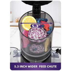 Funil Largo de 13,5 cm: Descubra o poder do nosso espremedor de 300W. Com um funil grande de 13,5 cm, é fácil de montar, operar e limpar. Frutas inteiras, como maçãs e vegetais, podem ser adicionadas diretamente, garantindo sucos frescos e saborosos a cada uso, com alimentação automática.