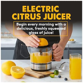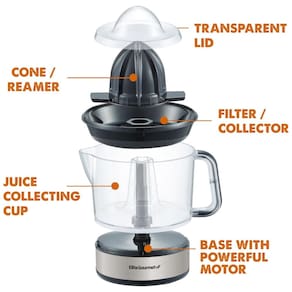 Espremedor de sucos elétrico Elite Gourmet com capacidade de 710ml, ideal para laranjas, limões e toranjas. Possui controle de polpa, é compacto, leve e fácil de usar. Livre de BPA, com motor silencioso e peças removíveis para fácil limpeza.Motor c/ dupla rotação