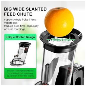Porque escolher nos Mais nutrientes, melhor valor O suco fresco em minutos permite que seu corpo absorva 4 vezes mais nutrição. Frutas não cortadas espremer frutas inteiras pequenas de uma vez, maximizar a produção de suco. A tampa inteligente sem respingos deixa a bancada limpa e de limpeza mais fácil. Design para dormir, visual moderno e inovador. Boca de alimentação grande , rampa larga , tubo de alimentação de 7cm Reduza o tempo de preparação da fruta. Acomode produtos maiores. Resistência ao entupimento durante a sucção contínua. Oxidação mínima A velocidade de rotação lenta leva a menos exposição ao oxigênio durante o processo de sucção. Velocidade lenta de 65 RPM, motor de indução 240W AC. Recipiente de suco selado evita a oxidação. Beba com mais segurança, o espremedor usa material sem BPA para ajudá lo a beber suco com mais segurança e desfrutar de um estilo de vida mais saudável. Observe que é muito importante escolher os ingredientes mais frescos para o melhor resultado de sucos. Robusto sem fim de saca rolhas, resistente o suficiente para esmagar até os produtos mais teimosos, como nozes e sementes duras. Mas frutas maduras demais não são ideais para fazer suco. Ingredientes que são muito moles são difíceis de espremer, ou seja, banana. Obtenha os sucos mais suaves e com baixo teor de fibras que você já provou. Nossa rolha de borracha opcional permite que você decida se deseja seu suco sem polpa ou não. Prevenir entupimento reverso, quando o entupimento ocorre durante o processo de sucção, simplesmente pressione REV rotação reversa por alguns segundos para desentupir e, em seguida, continue a espremer