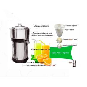 Espremedor de suco Informações técnicas: Cor: inox Indicado para: extrair suco de laranja e limão Material corpo: inox Alimentação - voltagem: bivolt manual chave seletora embaixo do motor Potência: 500 wats Rotação: 3.545 rpm. Dimensões do produto: Altura: 30 cm Prazo de : 06 meses contra defeito de fabricação Itens inclusos: 01 copo suco em pp 500 ml 01 peneira para copo em pp 01 castanha pequena em poliestireno limão 01 castanha grande em poliestireno laranja 01 cúpula com bica 01 tampa em alumínio 01 manual de instruções em português Ean: 7893108822208