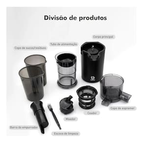 Potência de 200W, rotação de 45 rpm, sistema de separação de resíduos, filtro para bagaço, montagem e limpeza fáceis, ciclos de trabalho contínuo de até 10 minutos com intervalo de 5 minutos.Acompanha copo