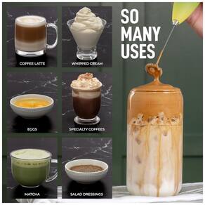 Matcha Whisking, Coffee More Funciona melhor do que um batedor matcha manual para fazer chá matcha e funciona muito melhor do que garfo ou batedor para café. Funciona muito bem para misturar bebidas nutritivas em pó de proteína sem recipiente extra, liquidificador ou agitador de garrafa para lavar. Use nosso mini mixer para suas necessidades de bater e misturar Dê um chute em batidos e smoothies saudáveis adicionando pó ou sabor de gemada e misturando.