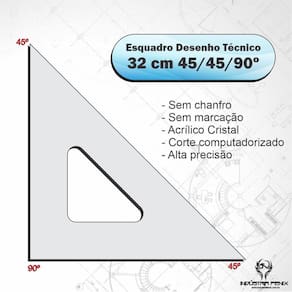 Esquadros de 32 cm 45 / 45 / 90º sem graduação e sem chanfro fabricado em acrilico cristal transparente na espessura de 2mm cortados a laser, garantindo um acabamento profissional, de qualidade e precisão na peça técnica.