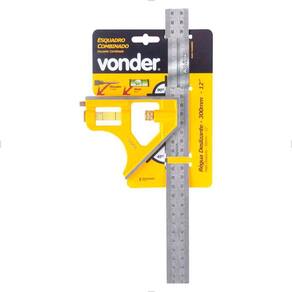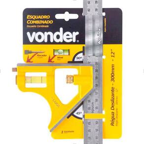 Ref.: 3550212000. Marca: Vonder. Graduação da escala: mm/pol. Capacidade: 300 mm. Largura da escala: 25,0 mm. Material da escala: Aço inoxidável. Material do corpo do esquadro combinado: Alumínio fundido. Massa aproximada (peso): 0,297 kg.